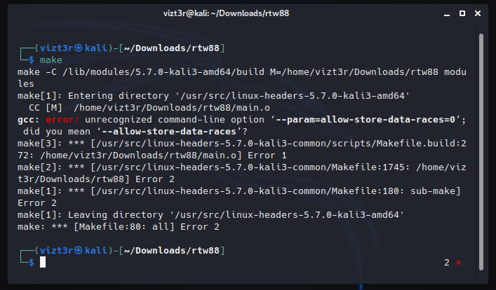 So i just upgraded the kernel version to 5.7.0 on kali 2020.3. And i wanted to installing wifi driver with rtl8723de chipset on my kali. When i am type "make" command on the terminal.. the error said "gcc: error: unrecognized command-line option --param=allow-store-data-races=0; did you mean --allow-store-data-races?".