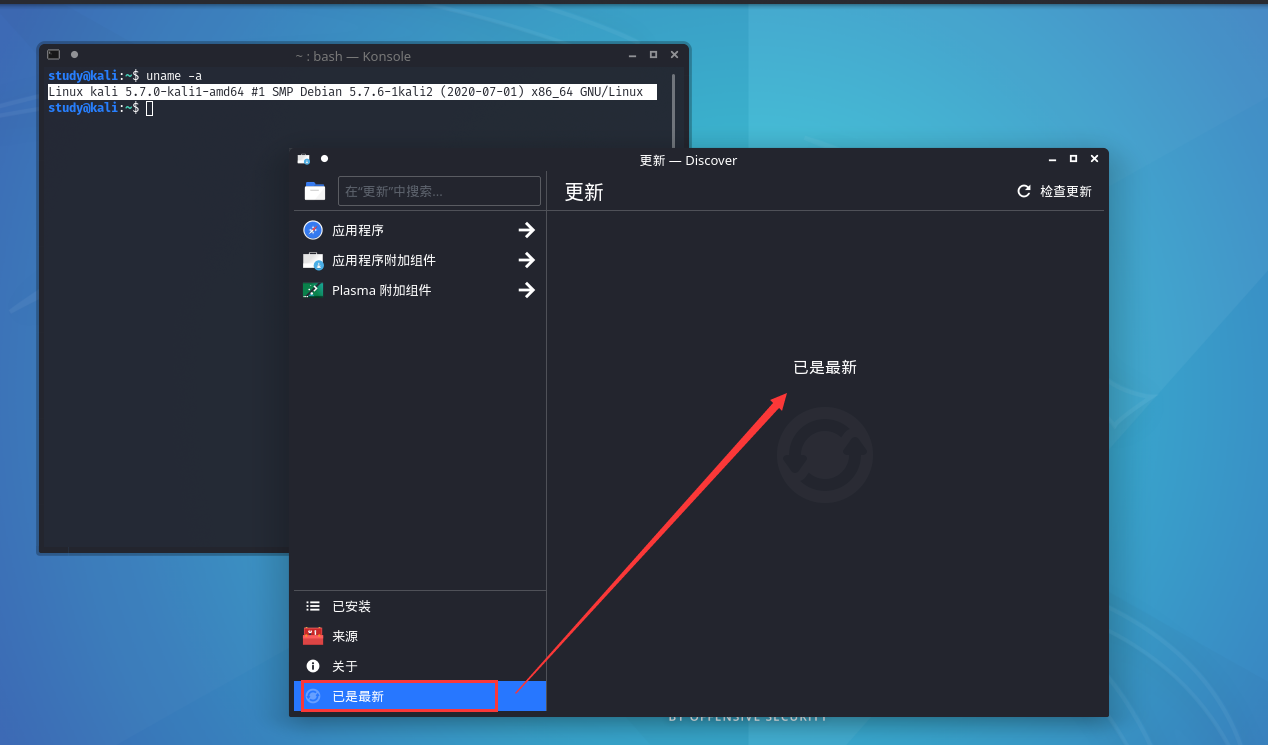 Update kali to "Linux kali 5.7.0-kali1-amd64 0000001 SMP Debian 5.7.6-1kali2 (2020-07-01) x86_64 GNU/Linux", which solves the problems of Discover crash and inability to select all and non-select all, |