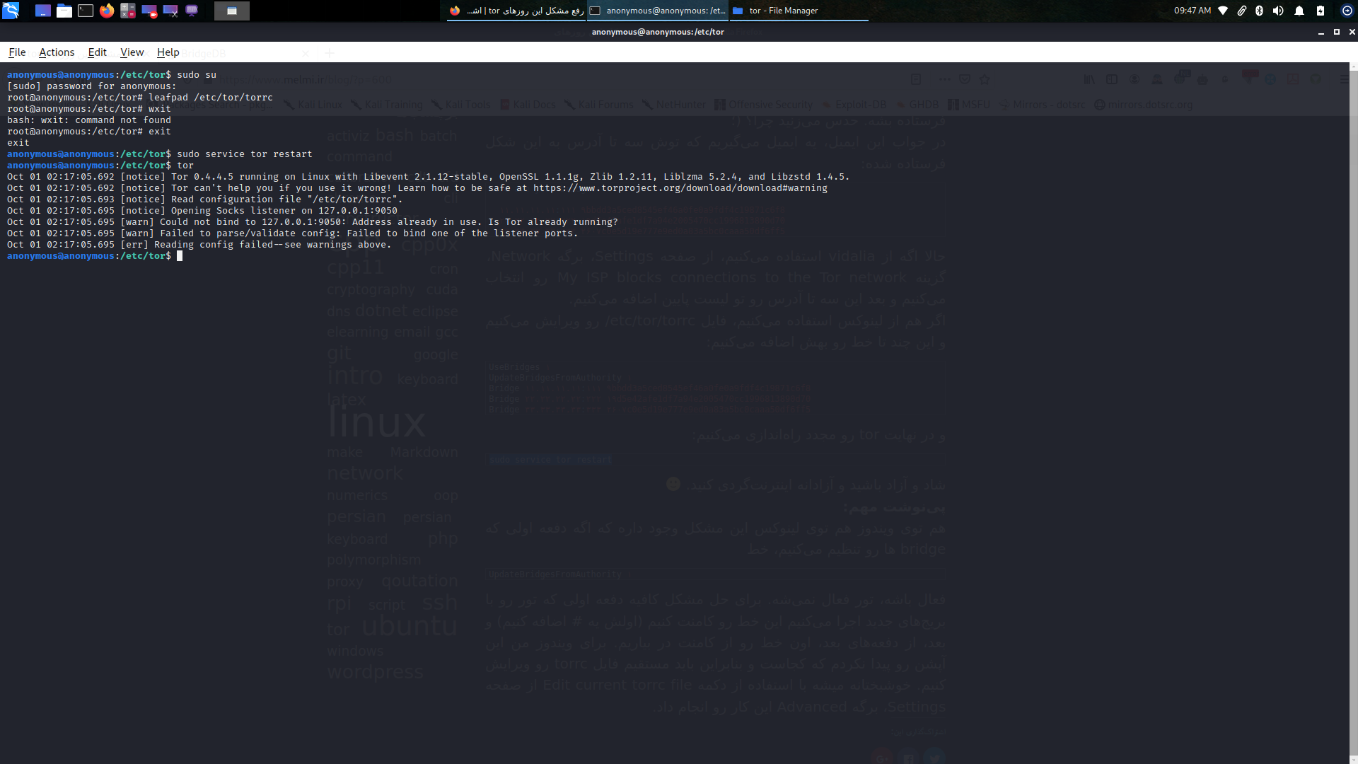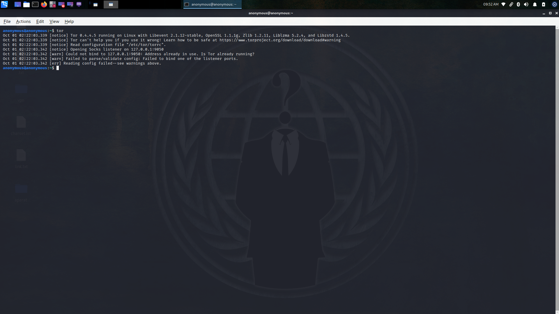 This is a bug tracker and not a support forum. Support requests should go to https://forums.kali.org That said, you already started tor, so when you ran it a second time, the port was already in use. |