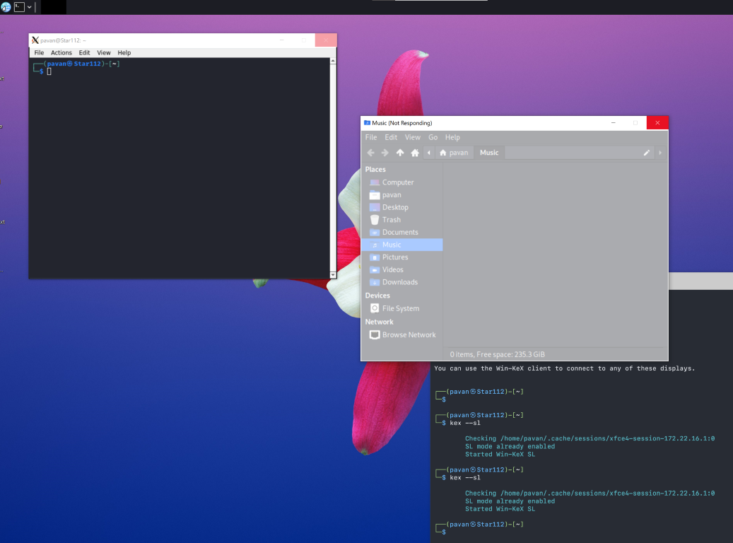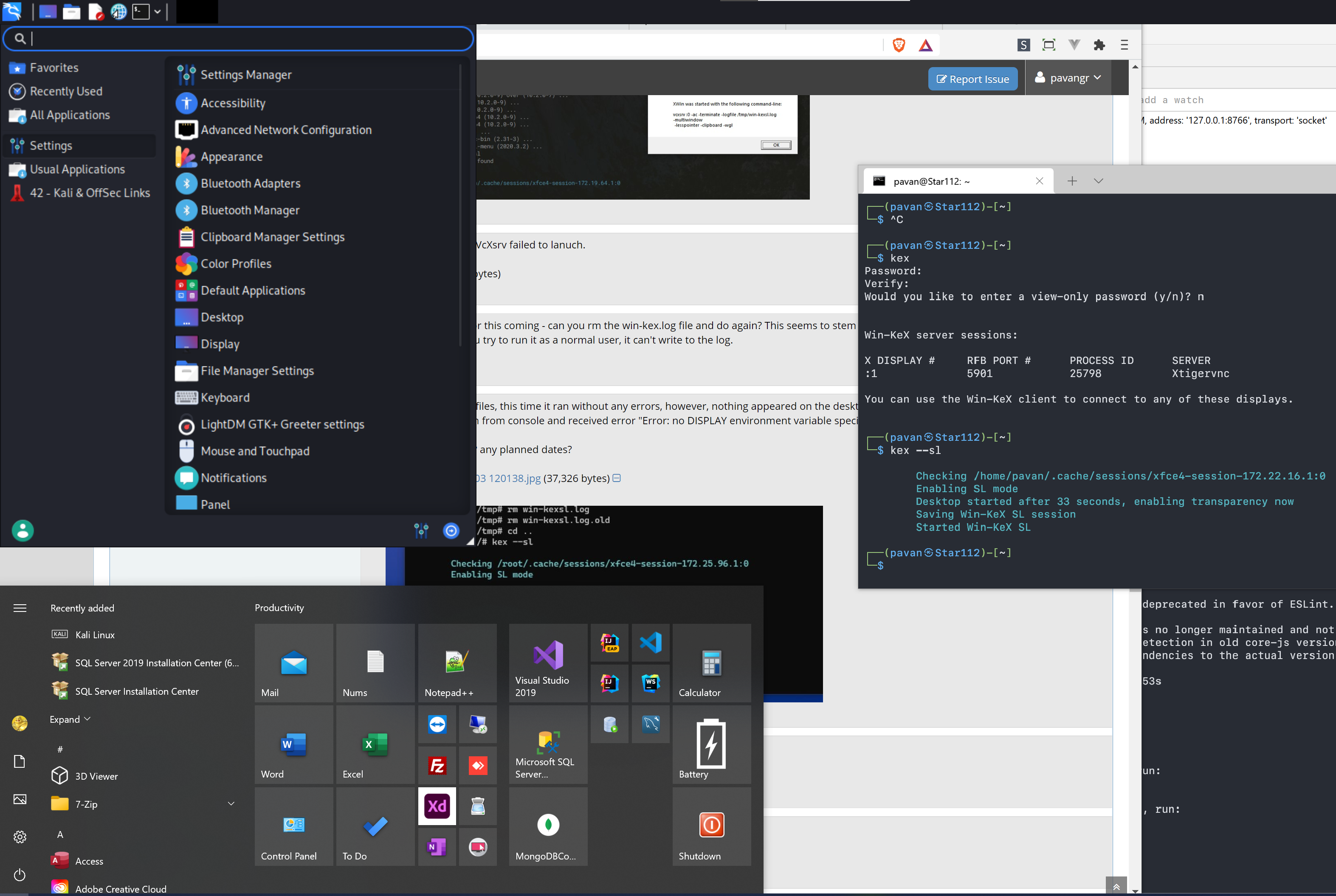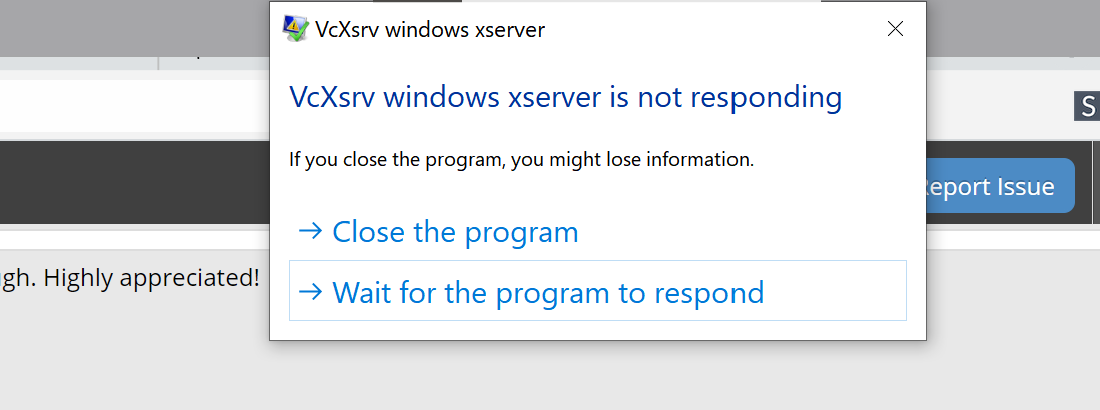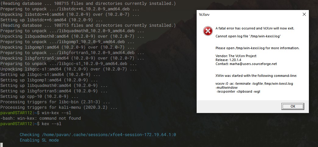 | Description | Using latest kali linux on Windows 10 x64 Version 2004 Build 19041.508), followed steps to install kex as given here: https://www.kali.org/docs/wsl/win-kex/ running kex as soon as I login to WSL works pretty fine, it launches window mode GUI and work flawlessly. Where as when I try the seamless mode, VcXsrv crashes showing fatal error message box. (attached screenshot for your reference). Please help me resolve this. | ||||