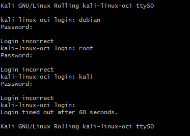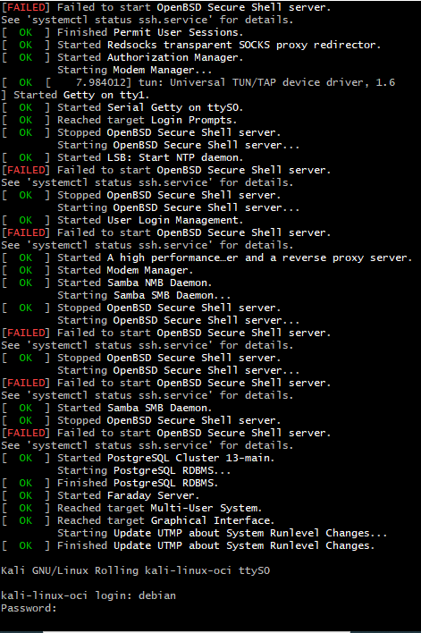 | Description | Hi Team, We have installed Kali Linux from Oracle cloud marketplace in OCI. The instance is provisioned successfully. Can you help us fixing the issue. Regards, | ||||
