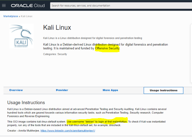 The overview in the cloud market place mentioned debian as the default user and also specified this kali linux distribution in maintained and funded by Offensive Security. |