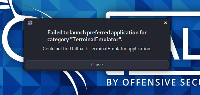 | Description | Hi team, Recently I'm Upgraded Kali Linux with this command " sudo apt update && apt upgrade" but after updating my terminal is not opening, it is showing that "Failed to launch preferred application for category 'TerminalEmulator' ". How to solve this problem any suggestion. | ||||