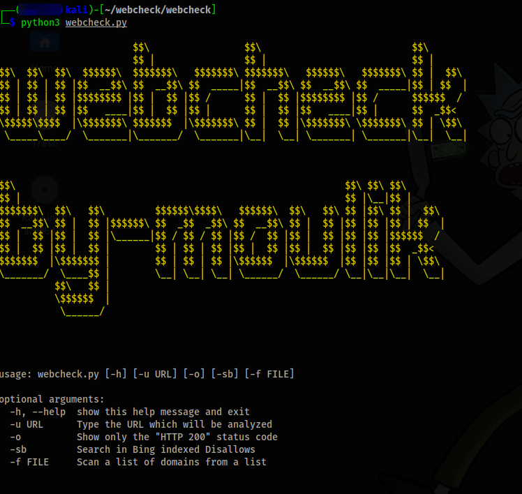 | Steps To Reproduce | [Installing]: open terminal [Usage]: usage: webcheck.py [-h] [-u URL] [-o] [-sb] optional arguments: [Example]: root@kali:~# python3 webcheck.py -u www.example.com -sb