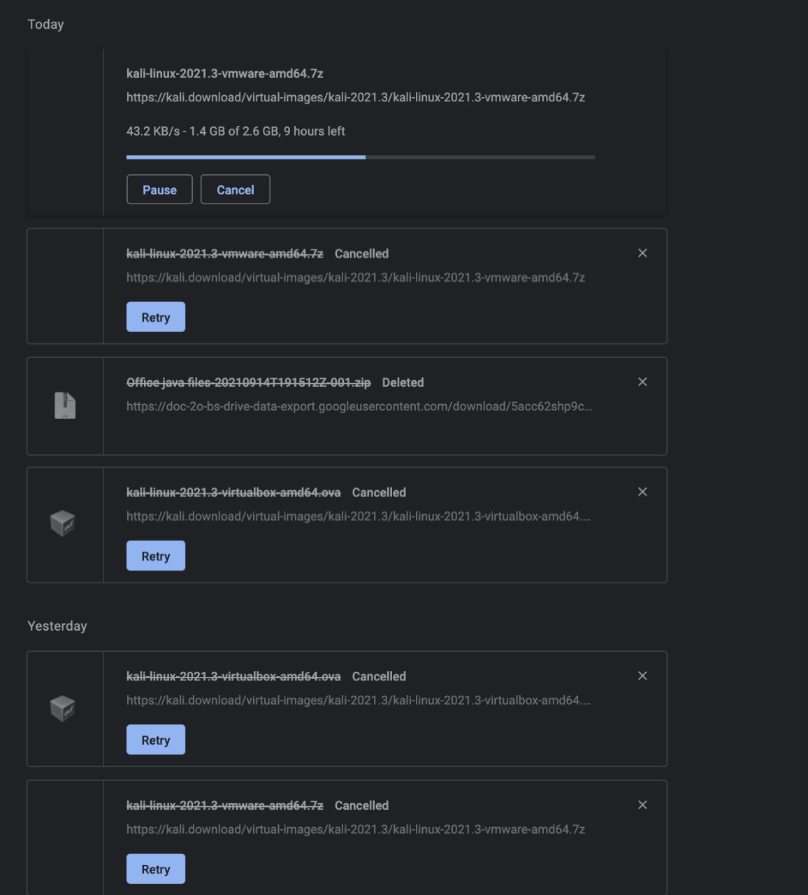 | Description | Unable to download Kali VM ISO file for mac from kali.org. Tried multiple times with multiple browsers. the download stops in mid saying 1 or 2 days required and fails. I have very high internet speed Result: issues with the website | ||||
