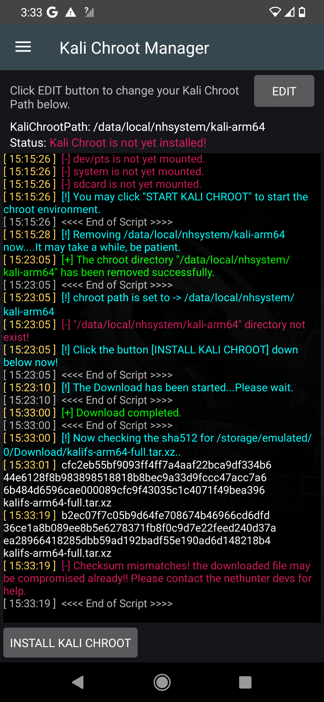 | Description | When I install Kali nethunter and go to terminal to start VNC it starts normally but after like 4 seconds I crashes the whole device PS I installed the bad checksum version and also the minimal OK one | ||||