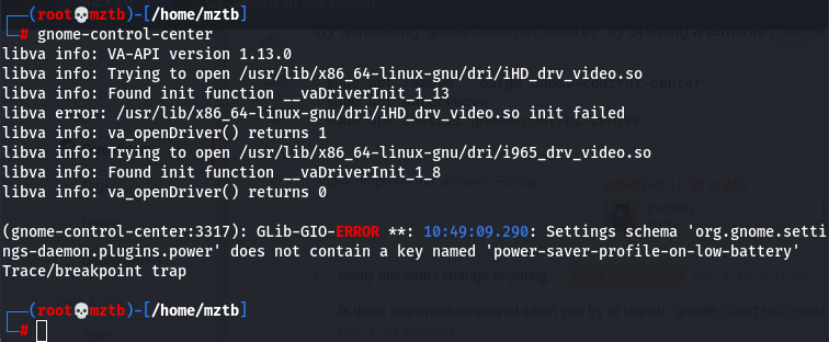 Ok, so I did it!!! the power panel can be opened normally with eithers operations: Either you upgrade to gnome 40.4 with kali-dev repo: "apt install -t kali-dev mutter gdm3 gnome-shell gnome-control-center gsettings-desktop-schemas gnome-desktop3-data gnome-session" I made both tests, and it's WORKING!!! |