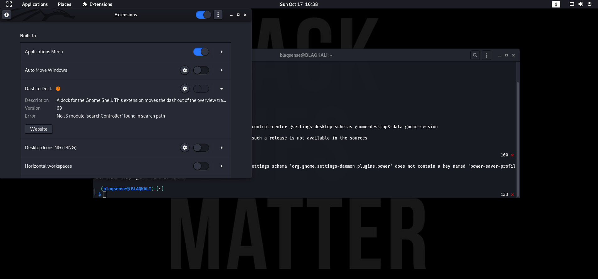 | Description | The Dash to Dock feature version 69 for kali side bar is blocked, an attempt to find the reason has been made using the settings button resulting in an error modal giving the following error response, The settings of extension [email protected] had an error: