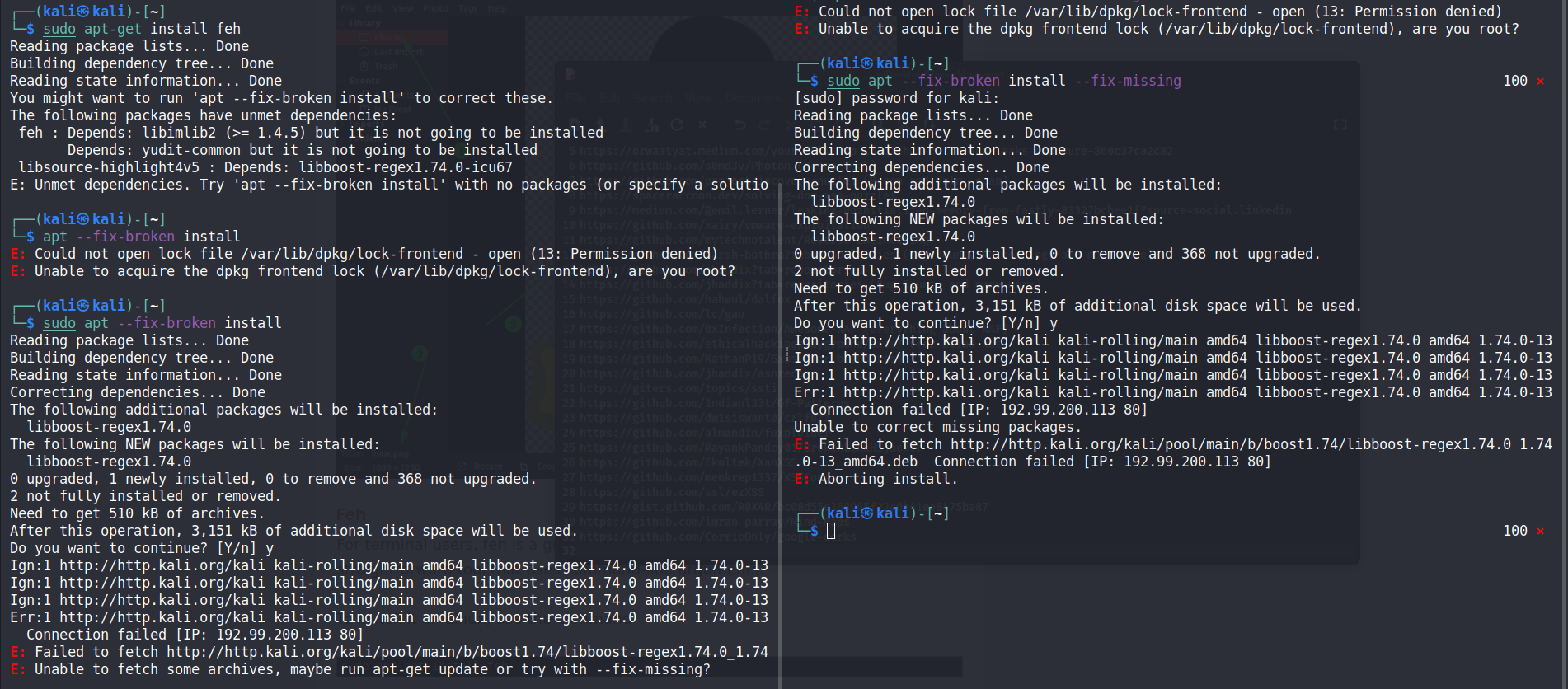 | Description | I downloaded VMware kali 2022.1v and imported in VMware. When I tried to install any package it sys not recognized command. In previous 2021.4a meta kali version iso file also had this issue and some old python and c/c++ packages were not installed. As I tried to install github package naabu written in go language. I gives me error of libpcap-dev. When I tried to install this it also gives me error. your provided command apt --fix-broken install also not working. frix-missing is not working. These all issues are arised after v2021.2. Please solve this problem ASAP. | ||||