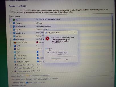 | Additional Information | it keeps happening when I import kali linux into virtualbox, the error keeps happening, please help with the problem | ||||