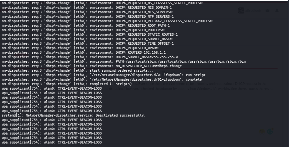 | Description | Recently, I updated my Kali Linux to the latest version along with the microcodes. Ever since then, the Wifi seems to be dropping. Also, the speed seems to be throttled due to the dropping. However, I checked the adaptor by booting into Windows. It's working fine there. I guess there's no issue with the hardware. | ||||