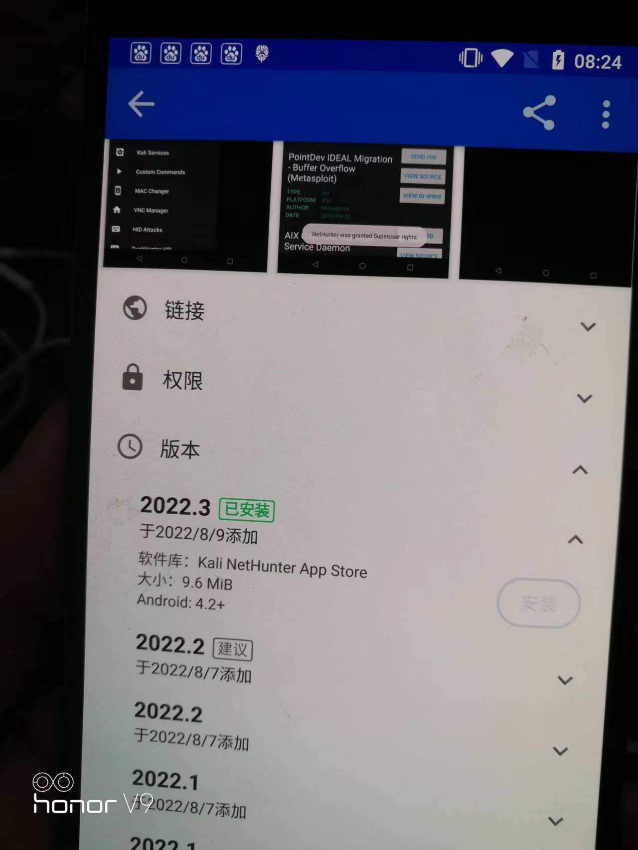 | Description | installing "nethunter-2022.2-angler-oreo-kalifs-full.zip" on the nexus 6p, open nethunter and always prompt "new app build detected: copying new files...",unable to continue operation | ||||