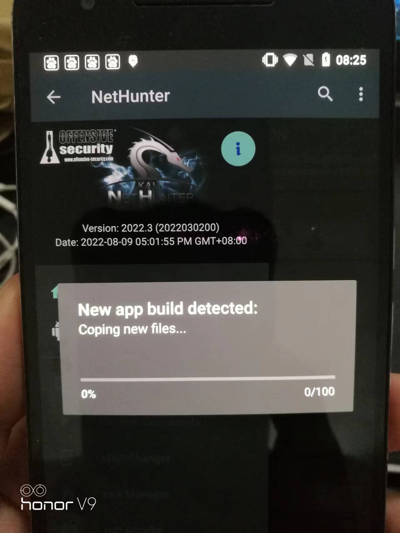 | Description | installing "nethunter-2022.2-angler-oreo-kalifs-full.zip" on the nexus 6p, open nethunter and always prompt "new app build detected: copying new files...",unable to continue operation | ||||