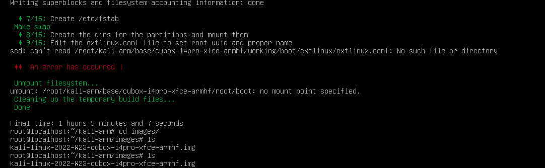 | Description | Kali Linux ARM build script fails to complete build the cubox-i4pro and cubox image. I attempted to build each image 4 time each, with and without using the builder.txt file, and it fails, "no mount point specified". I was able to build a Pinebook Pro image on my first attempt with no issue. | ||||