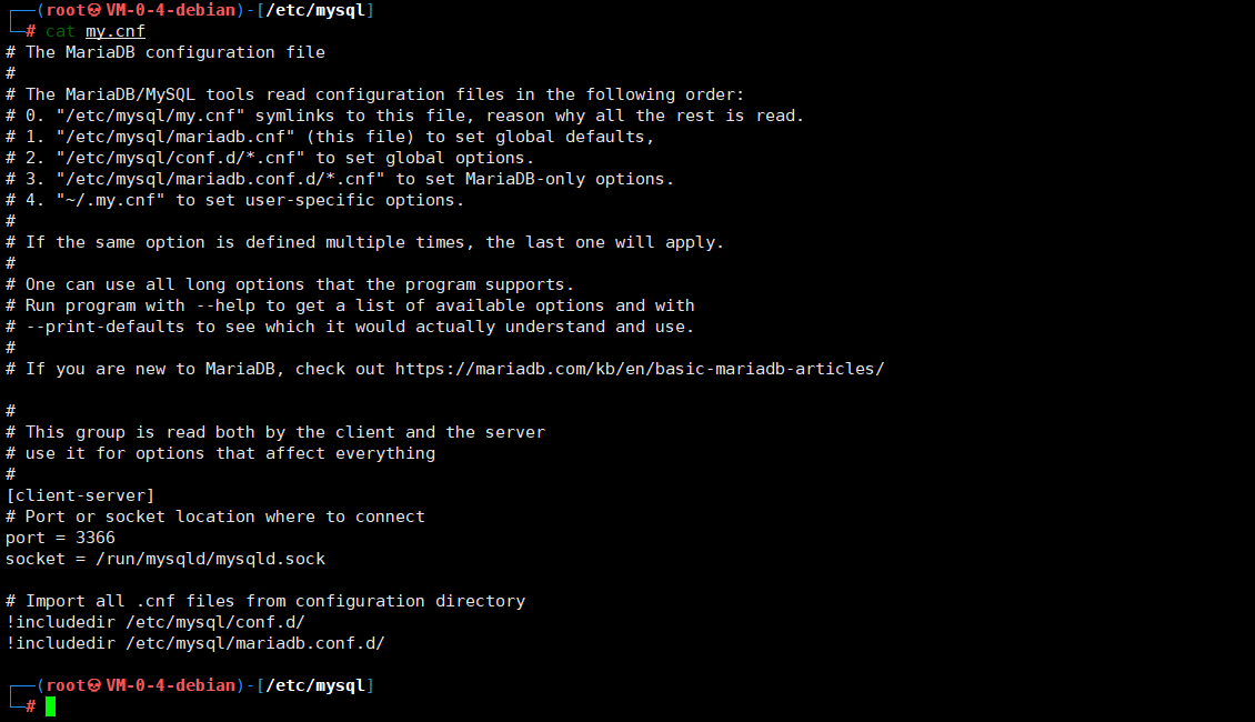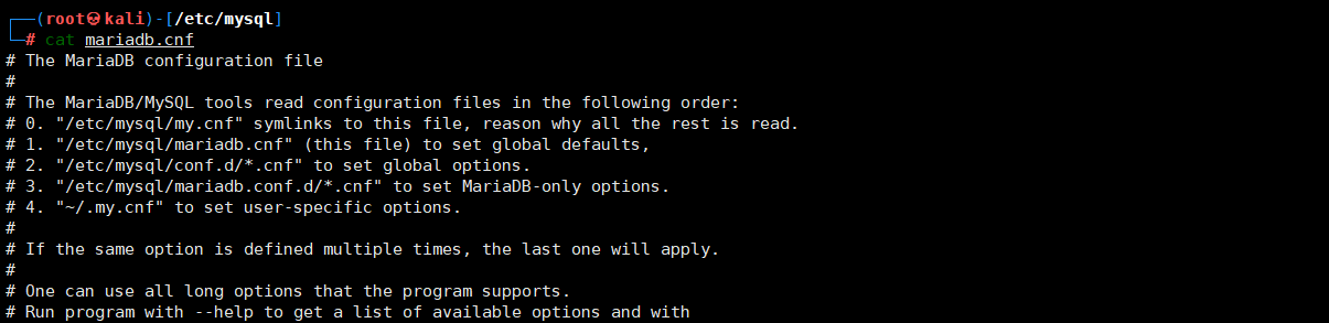 ┌──(root�kali)-[~] ┌──(root�kali)-[/etc/mysql] The MariaDB configuration file# The MariaDB/MySQL tools read configuration files in the following order:0. "/etc/mysql/my.cnf" symlinks to this file, reason why all the rest is read.1. "/etc/mysql/mariadb.cnf" (this file) to set global defaults,2. "/etc/mysql/conf.d/*.cnf" to set global options.3. "/etc/mysql/mariadb.conf.d/*.cnf" to set MariaDB-only options.4. "~/.my.cnf" to set user-specific options.# If the same option is defined multiple times, the last one will apply.# One can use all long options that the program supports.Run program with --help to get a list of available options and with--print-defaults to see which it would actually understand and use.# If you are new to MariaDB, check out https://mariadb.com/kb/en/basic-mariadb-articles/# This group is read both by the client and the serveruse it for options that affect everything# Port or socket location where to connectport = 3366 Import all .cnf files from configuration directory!includedir /etc/mysql/conf.d/ ┌──(root�kali)-[/etc/mysql] The MariaDB configuration file# The MariaDB/MySQL tools read configuration files in the following order:0. "/etc/mysql/my.cnf" symlinks to this file, reason why all the rest is read.1. "/etc/mysql/mariadb.cnf" (this file) to set global defaults,2. "/etc/mysql/conf.d/*.cnf" to set global options.3. "/etc/mysql/mariadb.conf.d/*.cnf" to set MariaDB-only options.4. "~/.my.cnf" to set user-specific options.# If the same option is defined multiple times, the last one will apply.# One can use all long options that the program supports.Run program with --help to get a list of available options and with--print-defaults to see which it would actually understand and use.# If you are new to MariaDB, check out https://mariadb.com/kb/en/basic-mariadb-articles/# This group is read both by the client and the serveruse it for options that affect everything# Port or socket location where to connectport = 3366 Import all .cnf files from configuration directory!includedir /etc/mysql/conf.d/ ┌──(root�kali)-[/etc/mysql] ┌──(root�kali)-[/etc/mysql/conf.d] ┌──(root�kali)-[/etc/mysql/conf.d] ┌──(root�kali)-[/etc/mysql/conf.d] ┌──(root�kali)-[/etc/mysql/conf.d] ┌──(root�kali)-[/etc/mysql/conf.d] ┌──(root�kali)-[/etc/mysql/mariadb.conf.d] ┌──(root�kali)-[/etc/mysql/mariadb.conf.d] ┌──(root�kali)-[/etc/mysql/mariadb.conf.d] |