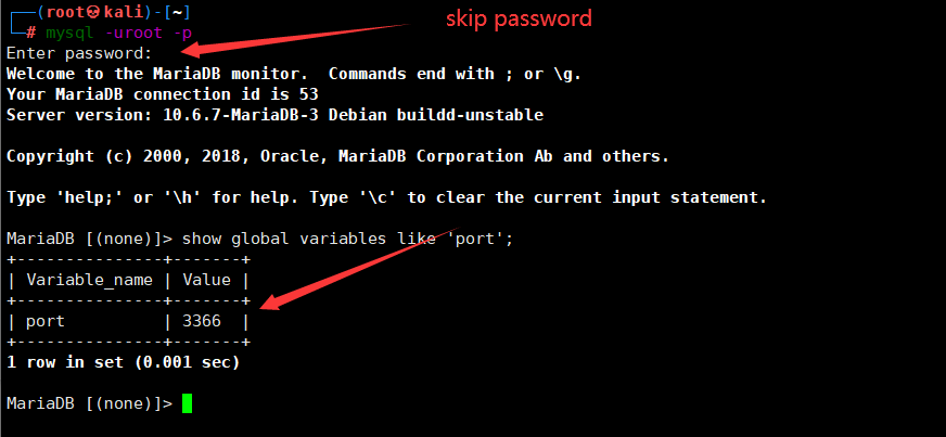 I used to add skip-grant-tables in /etc/mysql/my.cnf. It is normal to skip password verification. But I removed skip-grant-tables and typing mysql -uroot -p on the kali system also skips the password. |