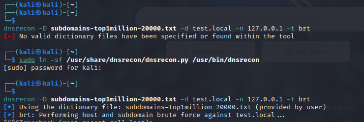 | Steps To Reproduce | cp /usr/share/seclists/Discovery/DNS/subdomains-top1million-20000.txt . dnsrecon -D ./subdomains-top1million-20000.txt -d test.local -n 127.0.0.1 -t brt | ||||