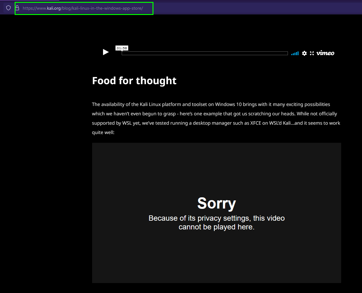 | Description | The video at the very bottom of https://www.kali.org/blog/kali-linux-in-the-windows-app-store/ says that the video cannot be played due to privacy settings. | ||||