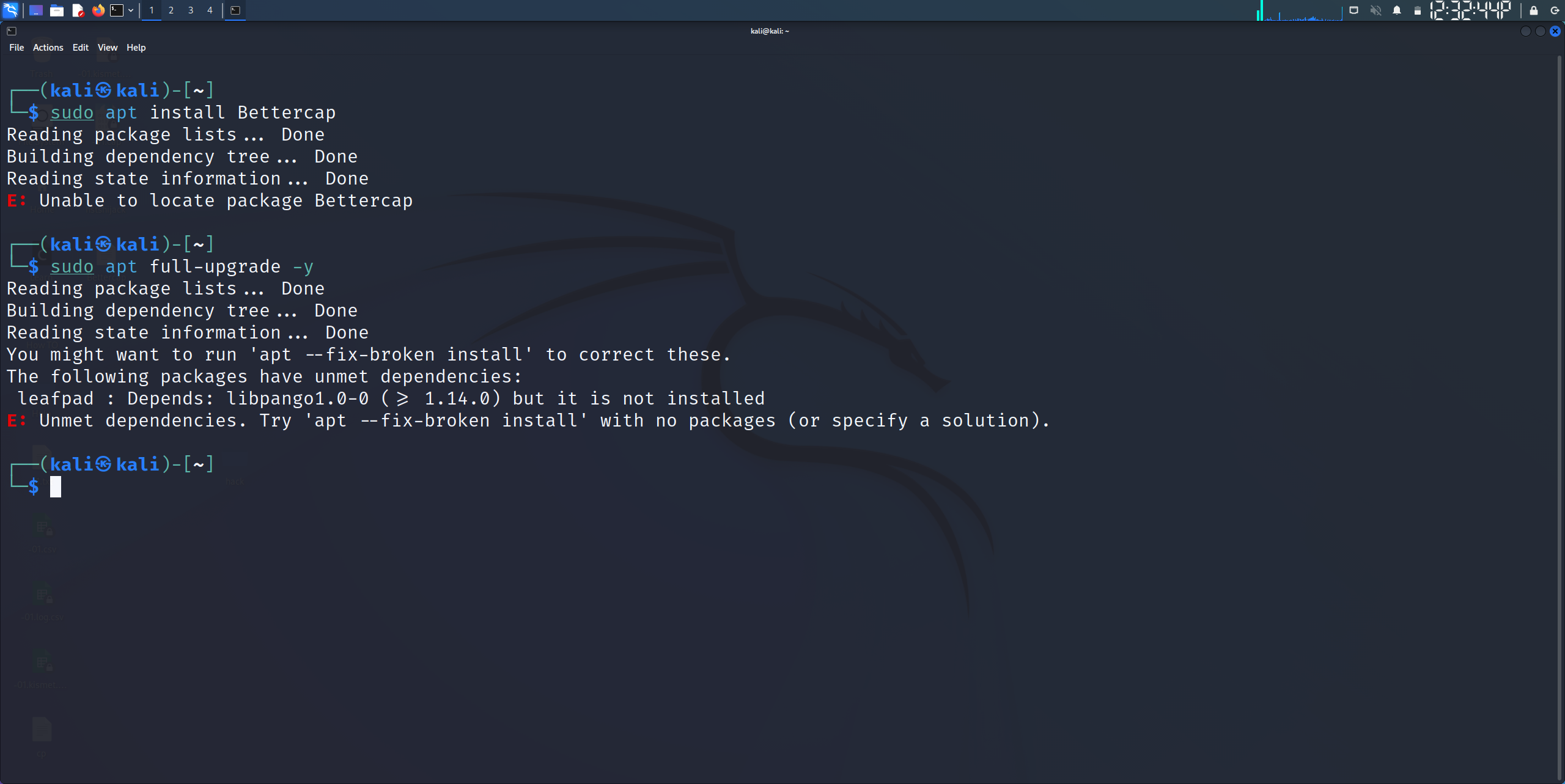 First, run "sudo apt update" Afterwards, run the command seen in the screenshot (sudo apt --fix-broken install) Lastly, the bettercap package is "bettercap", not "Bettercap". Try running "sudo apt install bettercap" after running the previously mentioned commands. |