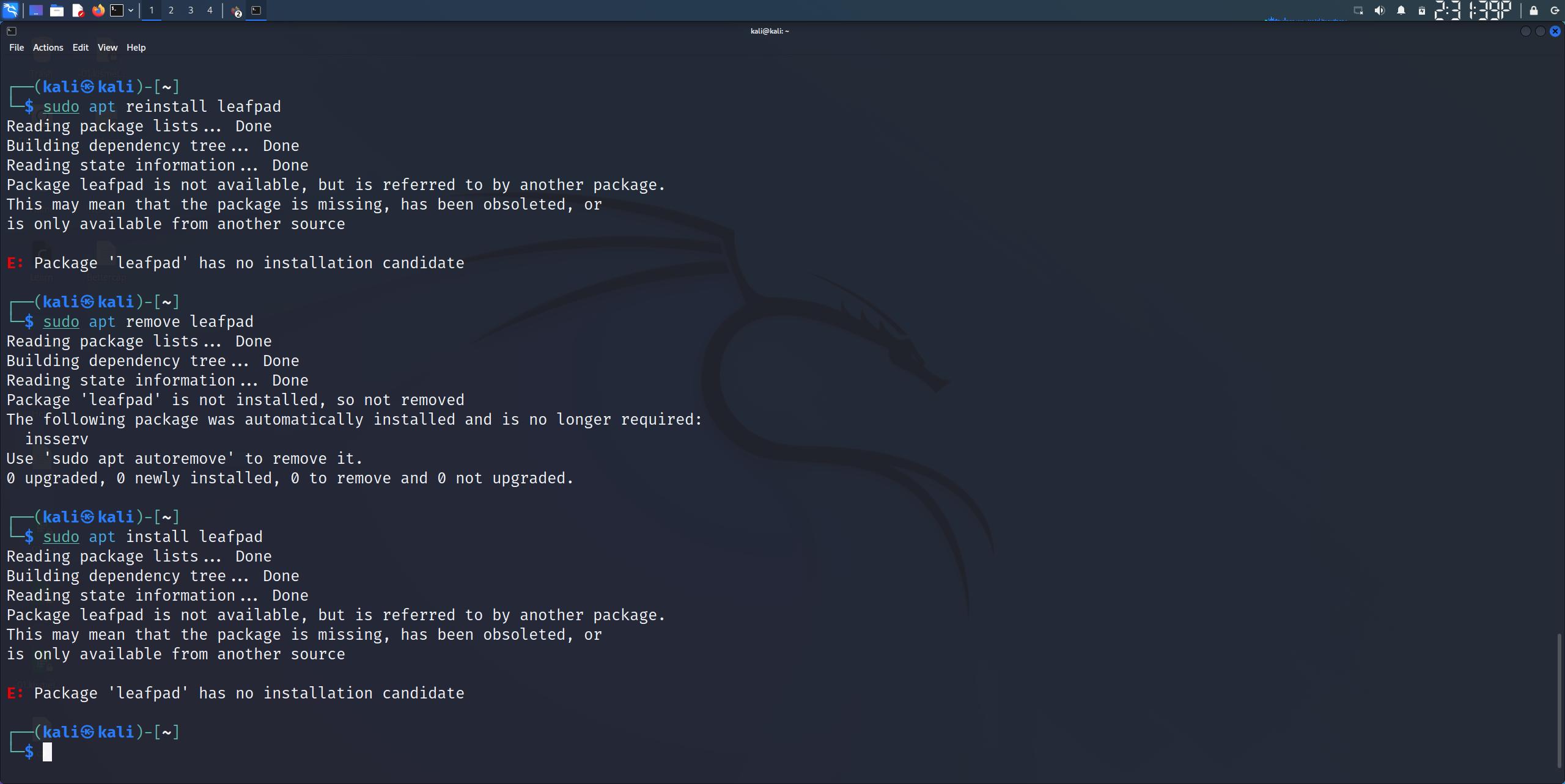 The cause of your issue is due to leafpad, as seen in the image. If those steps didn't fix the problem for you, try "sudo apt reinstall leafpad" or "sudo apt remove leafpad && sudo apt install leafpad" as an attempt to fix that. Usually, "sudo apt --fix-broken install" should fix the missing/broken dependency. I just confirmed that nothing causes an issue for me (whether I am installing leafpad or bettercap). Please try the 2 proposed solutions. |