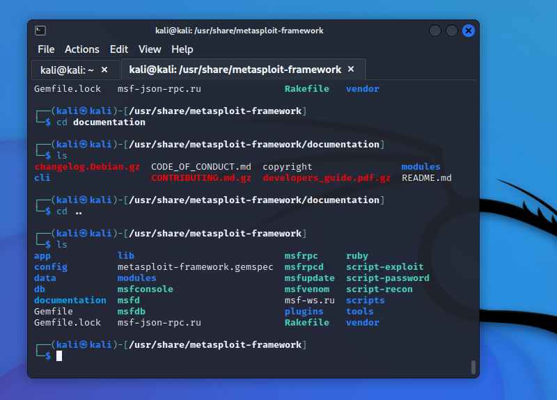 | Description | In normal source installs Metasploit Framework comes with a docs/ folder located under the root of where Metasploit Framework is installed. I along with my fellow Metasploit developers have been trying to push some of the documentation for Metasploit into this folder so that people can build the documentation locally and so that it is more easily accessible to users. However I have noticed that this folder is not distributed with the Kali Linux version of Metasploit. Instead I see other folders like db/ and documentation/, but not the docs/ folder I was looking for. | ||||