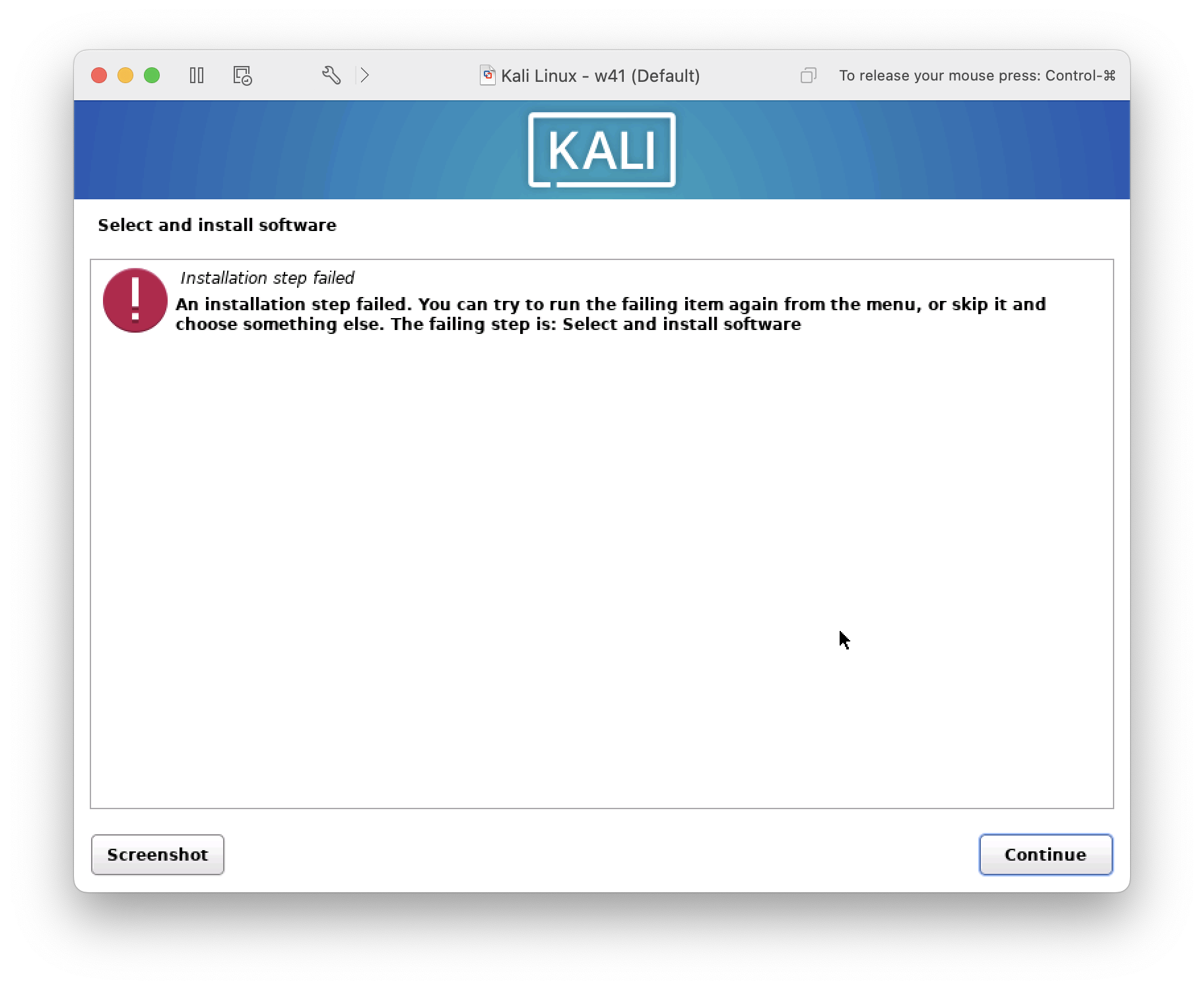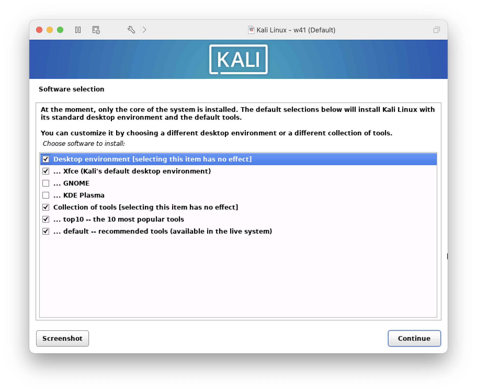 | Steps To Reproduce | Initiate a default installation with the current AMD64 ISOs in https://cdimage.kali.org/kali-weekly (https://cdimage.kali.org/kali-weekly/kali-linux-2022-W40-installer-amd64.iso & https://cdimage.kali.org/kali-weekly/kali-linux-2022-W41-installer-amd64.iso), i.e., do not change the default settings on "Software selection" page, in VMWare Fusion Pro 12.2.4 (20071091). | ||||