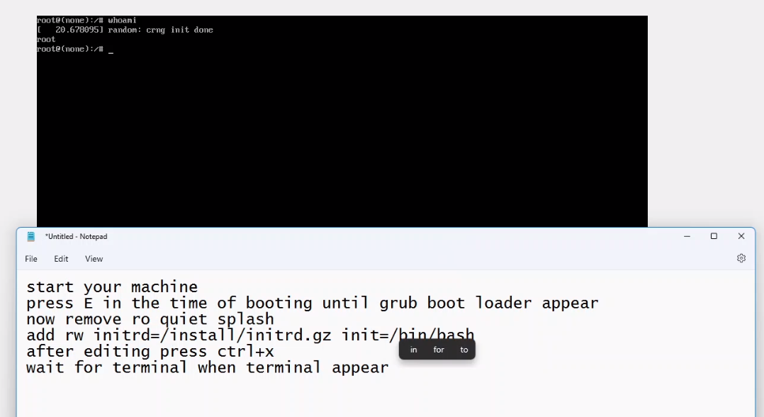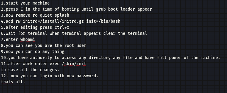 1.start your machine 2.press E in the time of booting until grub boot loader appear 3.now remove ro quiet splash 4.add rw initrd=/install/initrd.gz init=/bin/bash 5.after editing press ctrl+x 6.wait for terminal when terminal appears clear the terminal 7.enter whoami 8.you can see you are the root user 9.now you can do any thing 10.you have authority to access any directory any file and have full power of the machine. 11.after work enter exec /sbin/init to save all the changes. 12. now you can login with new password. thats all. | ||||