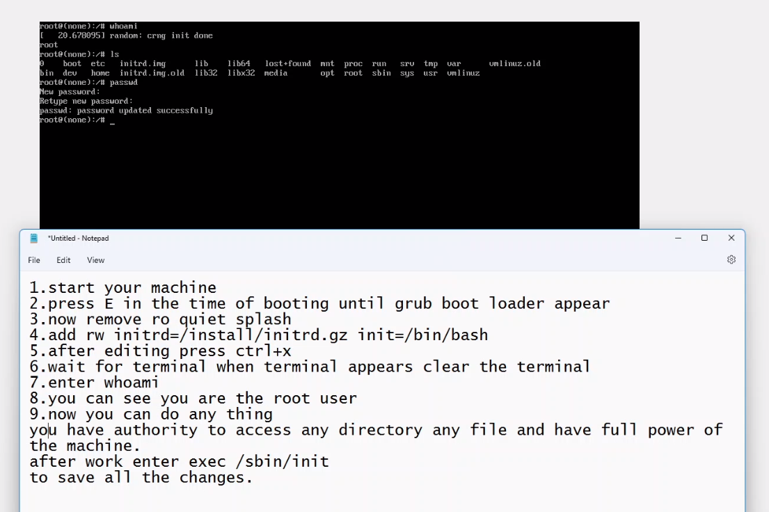 | Description | When my device or any device booting i can get access root terminal without any authentication. After that i can easily control every thing of the machine. I can change password of root user, can delete an existing user , any directory or file also can delete. Can install any package on the machine. Can create any folder or file in any location. | ||||