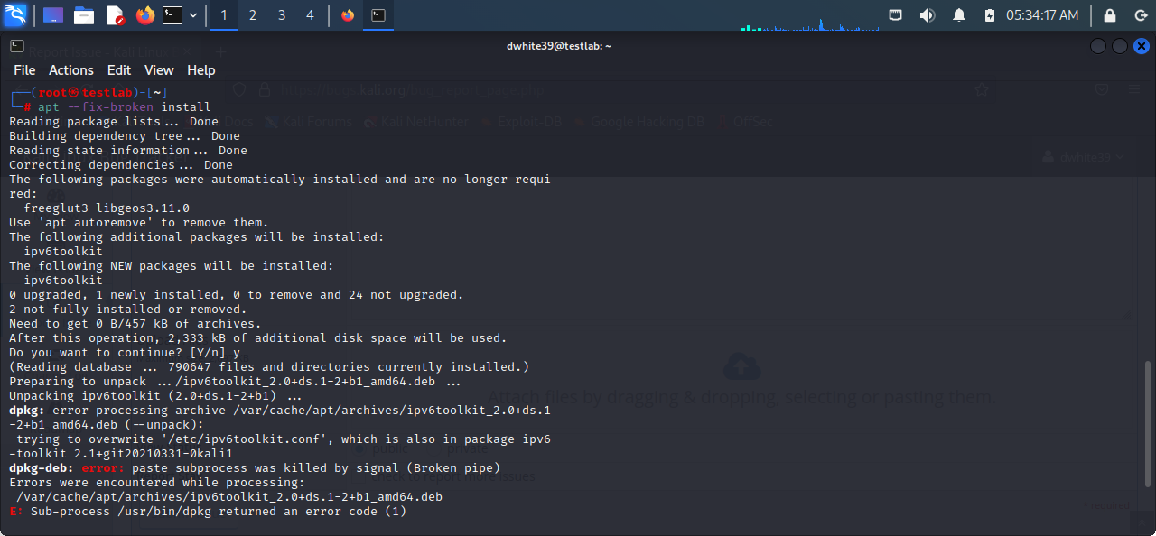 | Description | When trying to install the Forensic-extras package along with forensics-all i get error regarding file can not overwrite "trying to overwrite '/etc/ipv6toolkit.conf', which is also in package ipv6-toolkit 2.1+git20210331-0kali1" | ||||