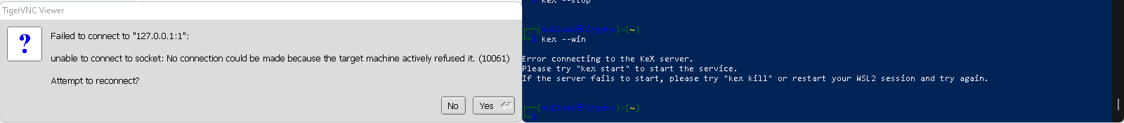 | Additional Information | Removing, Uninstalling, and purging of Kali-win-kex doesn't work or solve the issue either. I've also tried removing .X11-unix using sudo rm -rf /tmp/.X11-unix/ That also didn't solve my issue. Here's the things I tried to fix or solve the issue. sudo kex --kill sudo apt remove kali-win-kex kex --sl --wtstart -s (This still gave me errors and it still doesn't fix the issue) This issue is the same for all types and configurations for kex --win (broken) Error connecting to the KeX server. | ||||