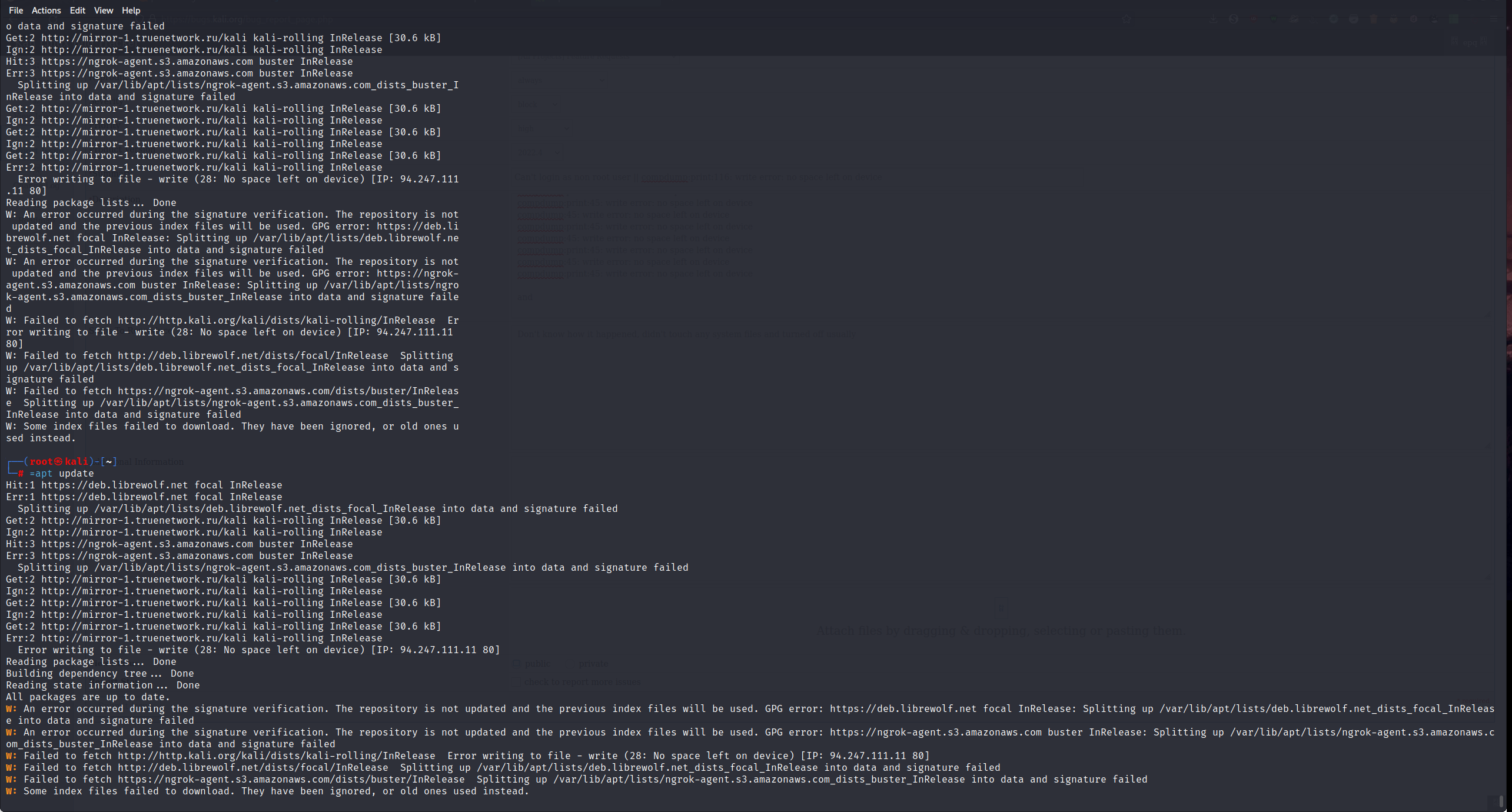 W: Failed to fetch http://http.kali.org/kali/dists/kali-rolling/InRelease Error writing to file - write (28: No space left on device) [IP: 94.247.111.11 80]