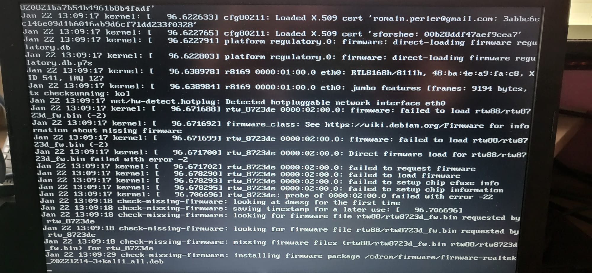 | Description | When i try to install kali linux on a laptop, the installation freezes on "Detect Network Hardware". | ||||