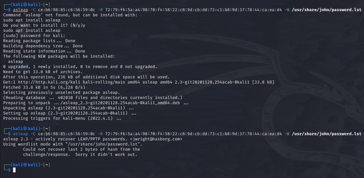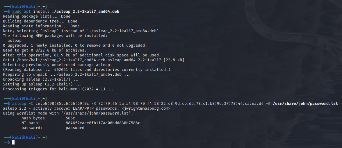 | Additional Information | To successfully crack the same MSCHAPv2 using asleap, I did the following. #Download libssl1.0.2 #Install libssl1.0.2 #Download asleap 2.2 #Install asleap 2.2 #Try to crack MSCHAPv2 using asleap and a wordlist such as /usr/share/john/password.lst (Password is password) | ||||
