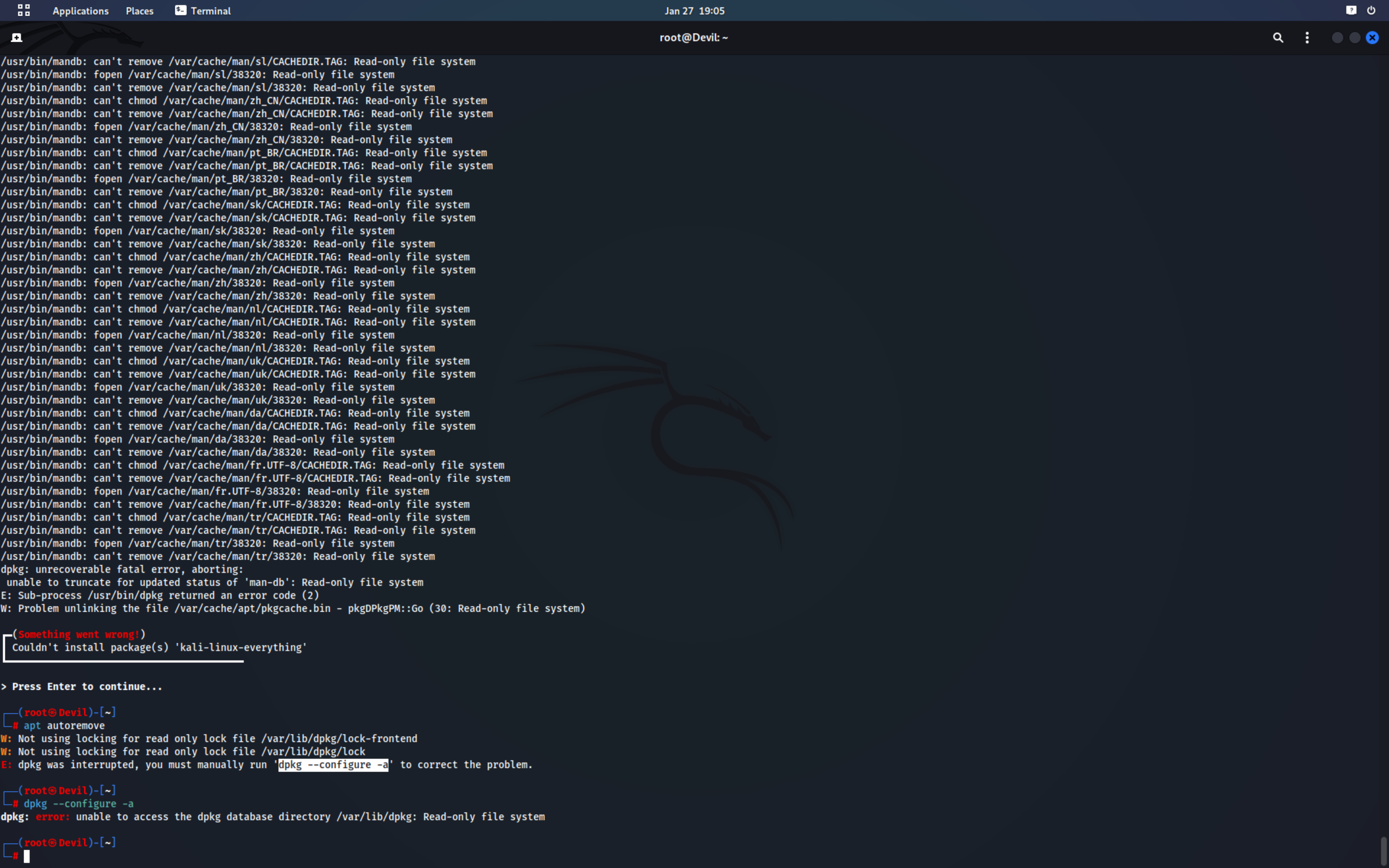 | Description | While installing the kali-everything package, the installation cannot be completed because of the read only file system. And when I restart kali linux it crashes. Kali Linux 2022.4 arm. UTM VM Apple virtualizer. | ||||