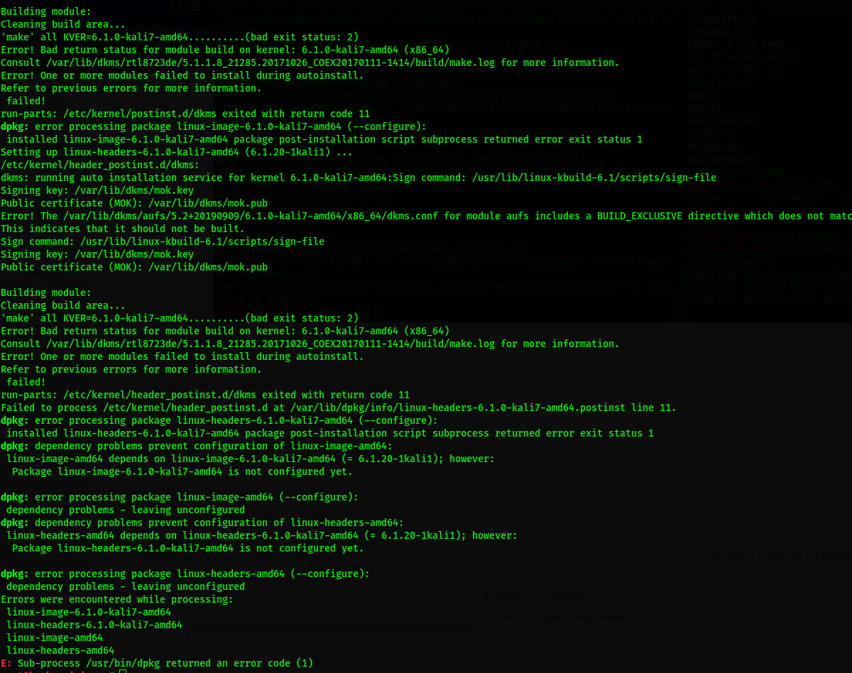 | Description | Error! The /var/lib/dkms/aufs/5.2+20190909/6.1.0-kali7-amd64/x86_64/dkms.conf for module aufs includes a BUILD_EXCLUSIVE directive which does not match this kernel/arch/config. | ||||