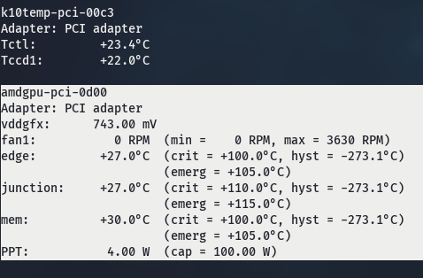 | Description | Running lm-sensors always outputs 0 on fan speed for AMDGPU using auto mode (hardware default). Fans are working, it's just a wrong output. Interestingly, using manual mode (echoing manually to /sys/class/drm. . . or with some external tool like amdfan) lm-sensors gets the right measure. Not sure this is a problem in lm-sensors itself or the driver. | ||||