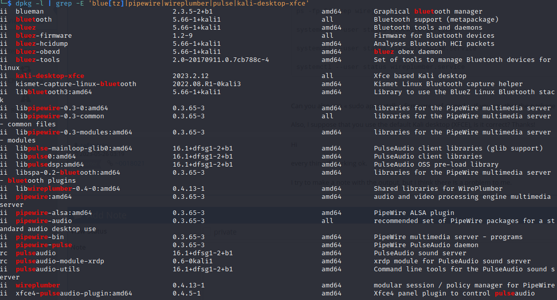 | Description | I installed Kali since a week as dualboot with win 11 and the audio doesn't work on the laptop, although it works with the bluetooth headset. I tried also alot of solutions, but nothing. https://www.kali.org/docs/troubleshooting/no-sound/ i will be very thankfull, if it works. | ||||
