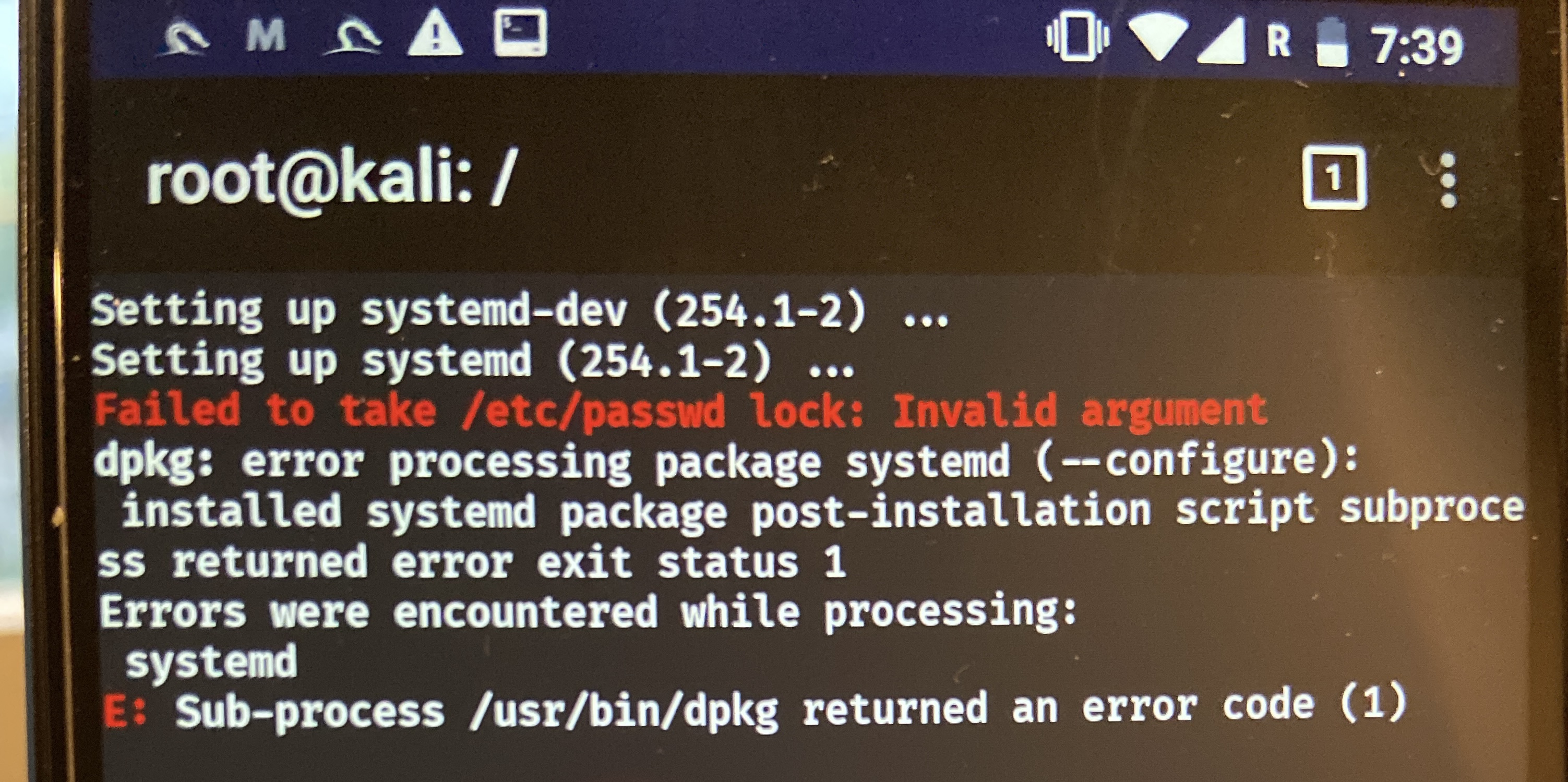 | Description | Running apt upgrade in Nethunter terminal returns errors with systemd during post installation process. | ||||