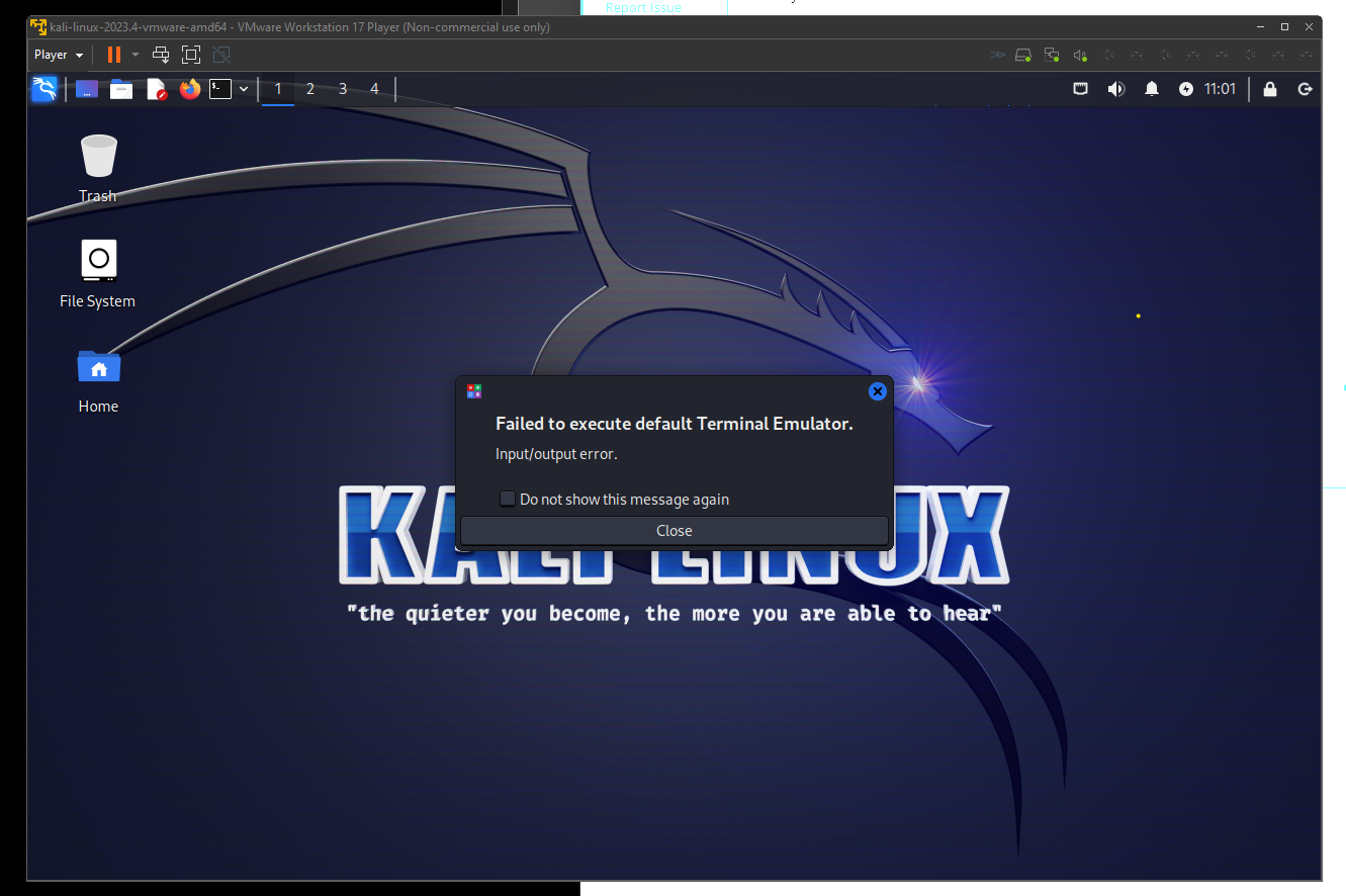 | Description | Hi, I've recently downloaded the latest VMware installation, provided 4 Cores , 80GB of HDD and 20 GB of RAM to use. However, upon restarting the Kali VM when accessing the terminal the message "Failed to execute default Terminal Emulator' pops up. I've attempted to use the other terminals that are included with the base 2023.4 installation of Kali, however, no terminals pop up when clicked. TLDR; When you update kali to the latest version via update | Upgrade, you can no longer use the terminal. I've deleted the VM, re-downloaded the base installation file and gone through the same update | upgrade process and the outcome is the same. | ||||