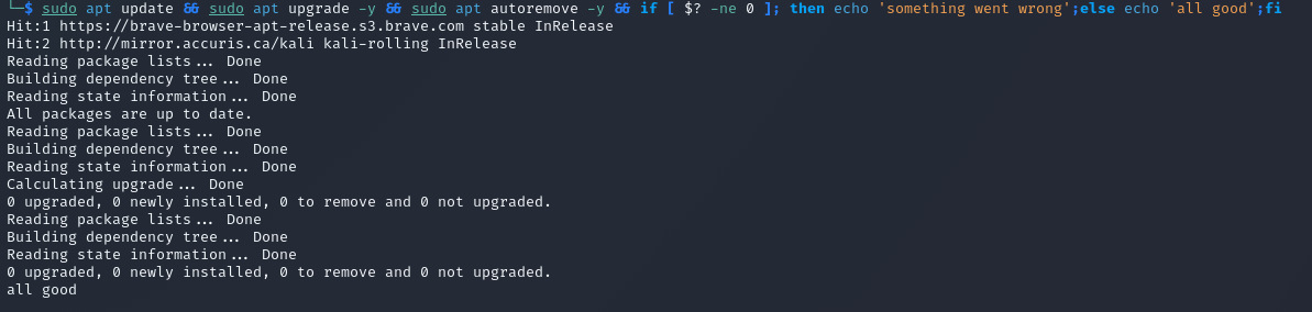 sudo apt update && sudo apt upgrade -y && sudo apt autoremove -y && if [ $? -ne 0 ]; then echo 'something went wrong';else echo 'all good';fi