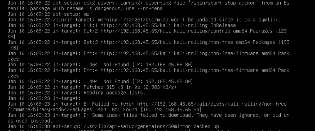 This is not a bug. The installer fails to reach the mirror, and the mirror is 192.168.45.65. This is an IP on your local network, this is something you configured. I suppose you configured a proxy mirror, or a custom mirror, or something, early during the install steps. You did set this mirror to http://192.168.45.65/kali, but there's nothing at this IP. In short: your configuration is not correct. To be a bit more precise... It's only request for non-free-firmware that fails. So it's likely that your mirror at 192.168.45.65 is either 1) unreachable or 2) outdated, thus it doesn't have the non-free-firmware directory in there. |