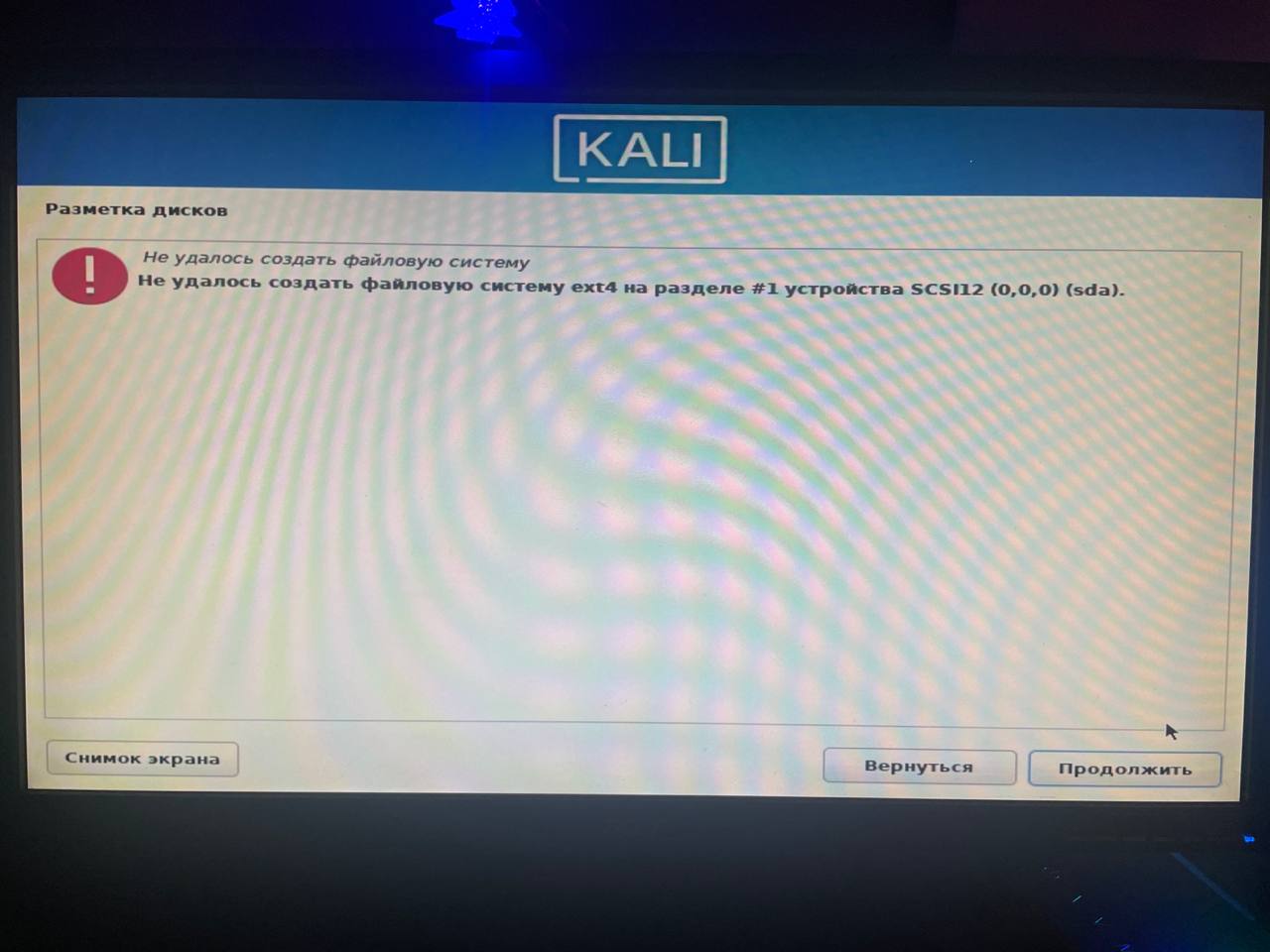 With so little information, and a screenshot in Russian, there's absolutely nothing we can do to help. For help using Kali, consider reaching out to Kali: https://www.kali.org/community/ If you're sure it's a bug, then open a proper bug report, with all the information needed: https://www.kali.org/docs/community/submitting-issues-kali-bug-tracker/ Thanks! |
