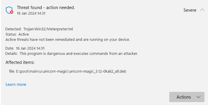 | Summary | 0008594: Trojan.Win32/Meterpreter!ml | ||||
