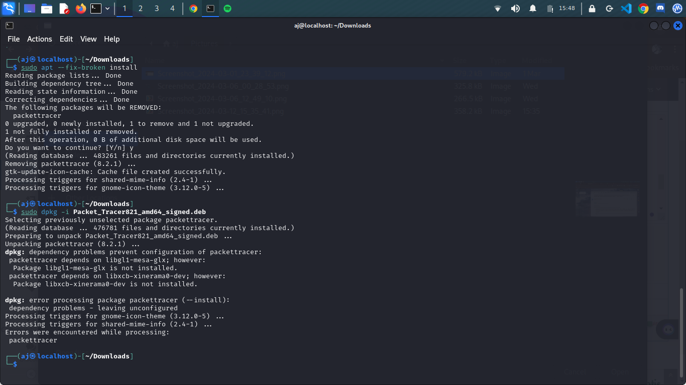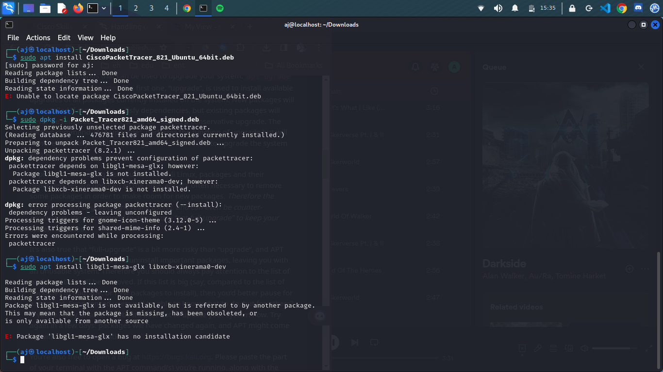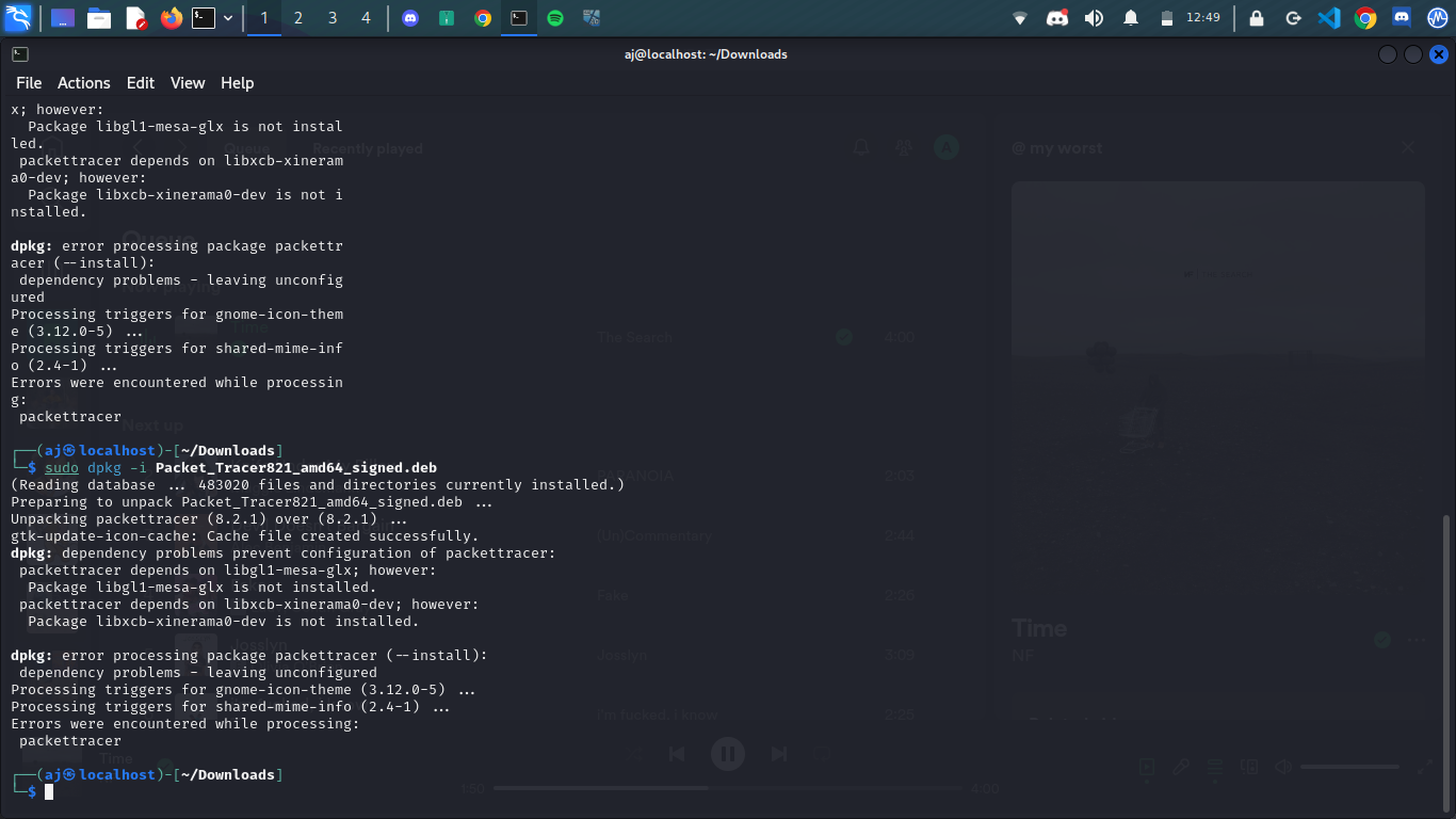 | Description | I have been trying to install packet tracer from cisco after installing kali Linux in a new machine and this is what has been happening with same consistent error. Sudo apt install CiscoPacketTracer_821_Ubuntu_64bit.deb Sudo dpkg -i Packet_Tracer821_amd64_signed.deb dpkg: error processing package packettracer (--install): Sudo apt install libgl1-mesa-glx libxcb-xinerama0-dev Reading package lists... Done E: Package 'libgl1-mesa-glx' has no installation candidate sudo apt --fix-broken install sudo dpkg -i Packet_Tracer821_amd64_signed.deb dpkg: error processing package packettracer (--install): | ||||