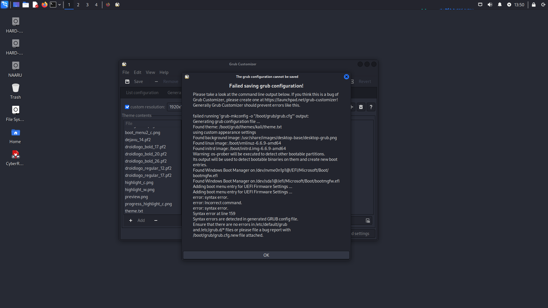 | Description | WHEN I APPLY A GRUB THEME BY EVERY TYPE OF METHOD , WHETER BY USING A GRUB-CUSTOMIZER OR IN MANUAL WAY , I GET SUCH TYPE OF ERROR. I AM VERY NEW AND NOOB IN THIS FIELD , HELP ME OUT ! | ||||