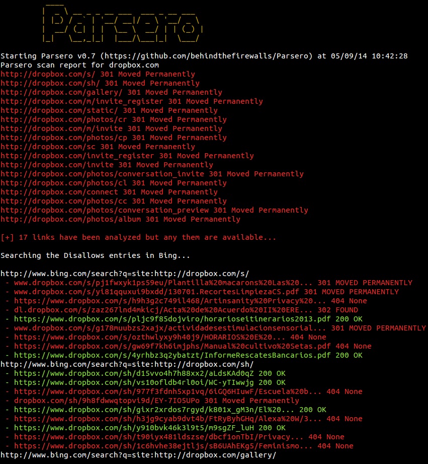 Update: Some times the links indexed by Bing are available and sometimes not, now Parsero check each one (in the first Bing results page) in order to print out if they are available or not. |