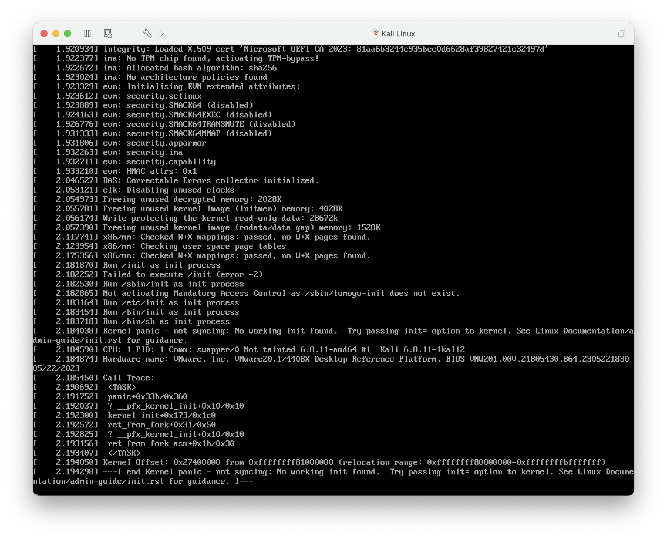 | Description | W26 AMD64 installer ISO (https://cdimage.kali.org/kali-weekly/kali-linux-2024-W26-installer-amd64.iso) and W26 Live ISO (https://cdimage.kali.org/kali-weekly/kali-linux-2024-W26-live-amd64.iso) installations both fail in VMware Fusion Pro (error message: Kernel panic - not syncing: No working init found.) I think it's a general issue rather than a virtualization issue. I'm attaching screenshots of both default and advanced installation attempts. | ||||