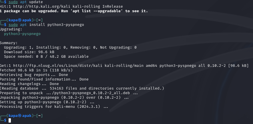| Description | So I attached the pictures to explain the bug/problem, I also tried "sudo apt-get install --reinstall python3-pyspnego" and "sudo apt-get install --only-upgrade python3-pyspnego" but the problem still exists, so I don't know what's wrong with it | ||||