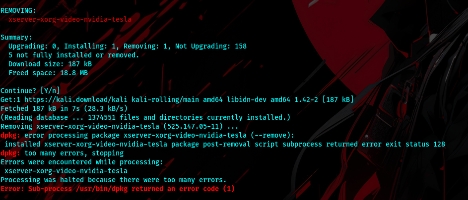 | Description | Breakdown of the Error: The error message indicates that the dpkg package manager encountered problems while trying to remove the xserver-xorg-video-nvidia-tesla package. Specifically, the post-removal script of this package returned an error code of 128. Potential Causes: Dependency Issues: The xserver-xorg-video-nvidia-tesla package might have dependencies that are still in use by other applications. These dependencies could be preventing its removal. | ||||