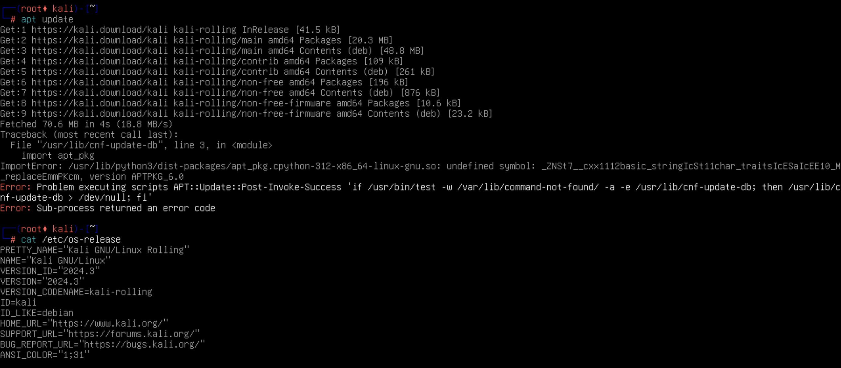 | Description | An "undefined symbol" error occurs on a fresh install of Kali 2024.3 during any apt command. All apt actions include an error which prevents automation (ansible) from working. This is an upstream bug in the python-apt package: https://www.mail-archive.com/[email protected]/msg699265.html It has been fixed, and 2.9.2 has been released: https://tracker.debian.org/news/1591007/accepted-python-apt-292-source-into-unstable/ python-apt 2.9.2 needs to be imported into kali-rolling to fix this issue. | ||||